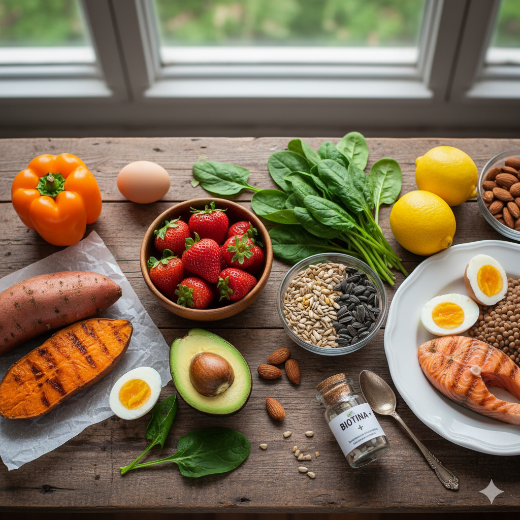 La biotina es la «celebridad» de los suplementos capilares. Es esencial para la producción de queratina, la proteína que forma la estructura del cabello, la piel y las uñas.